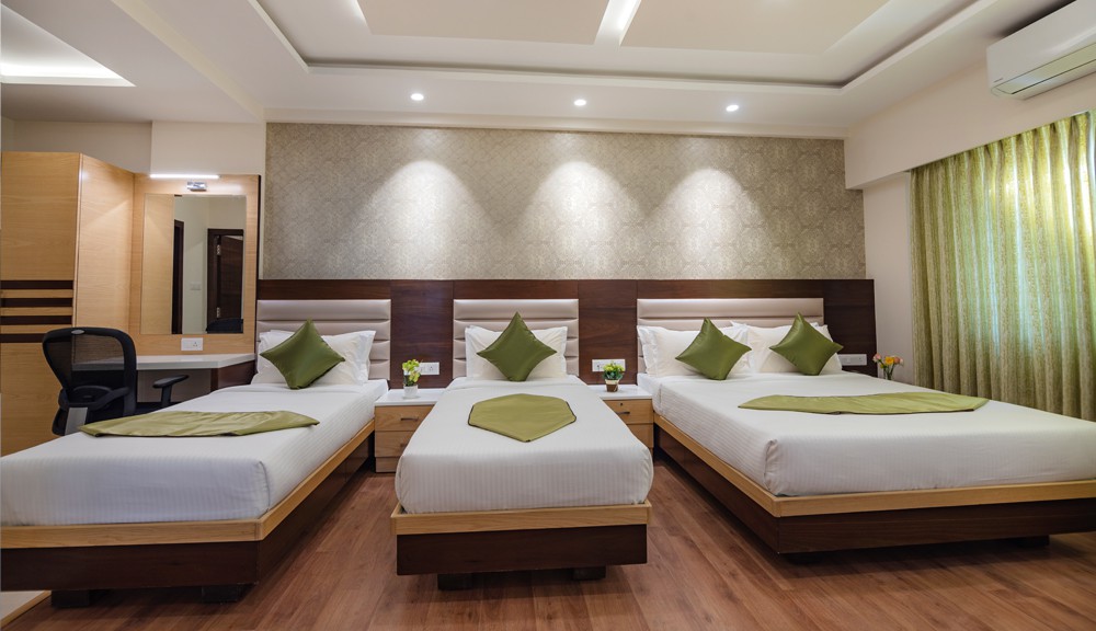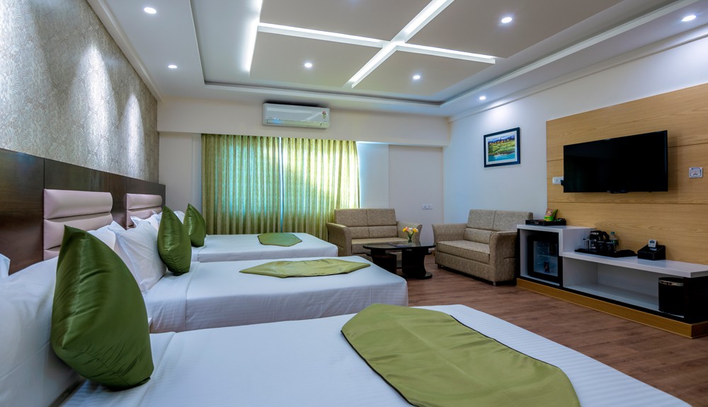 Our hotel features 6 luxurious Deluxe Suites spread across all the floors, each of these rooms has an area of 425 sft., with 1 king bed and 2 single beds and 2 bathrooms. This suite is for of its kind in this location and accommodate up to 5 adults.